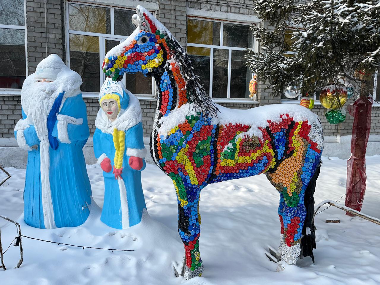 Во дворе учебного заведения тоже можно заметить креативный подход к использованию крышек. Из них создали красивую фигуру.