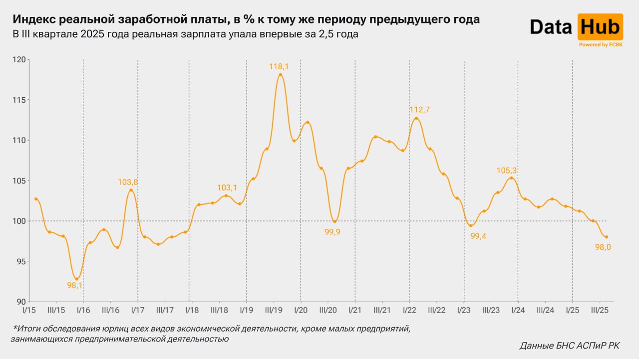 Однако при учете роста цен на товары и услуги динамика оказывается отрицательной, -2%. Реальное падение года к году фиксируется впервые за 2,5 года, приводит данные БНС АСПиР РК.