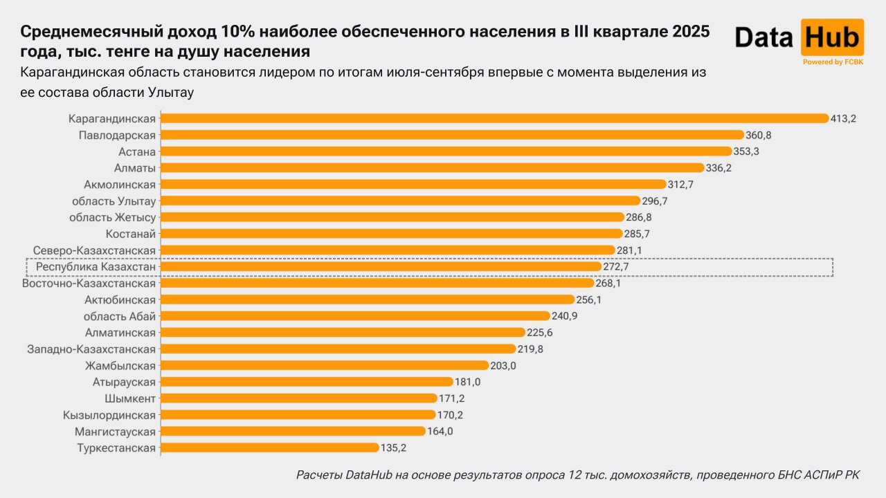 По итогам третьего квартала текущего года 10% наиболее обеспеченных жителей Карагандинской области располагали среднемесячным доходом в размере 413,2 тысячи тенге на душу населения. Это в 1,5 раза больше по сравнению со значением, рассчитанным для всей страны (272,7 тысячи тенге). Нигде больше в Казахстане показатель не находится на таком высоком уровне, свидетельствуют данные БНС АСПиР РК, передает Arnapress.kz со ссылкой на Telegram-канал DATA HUB.