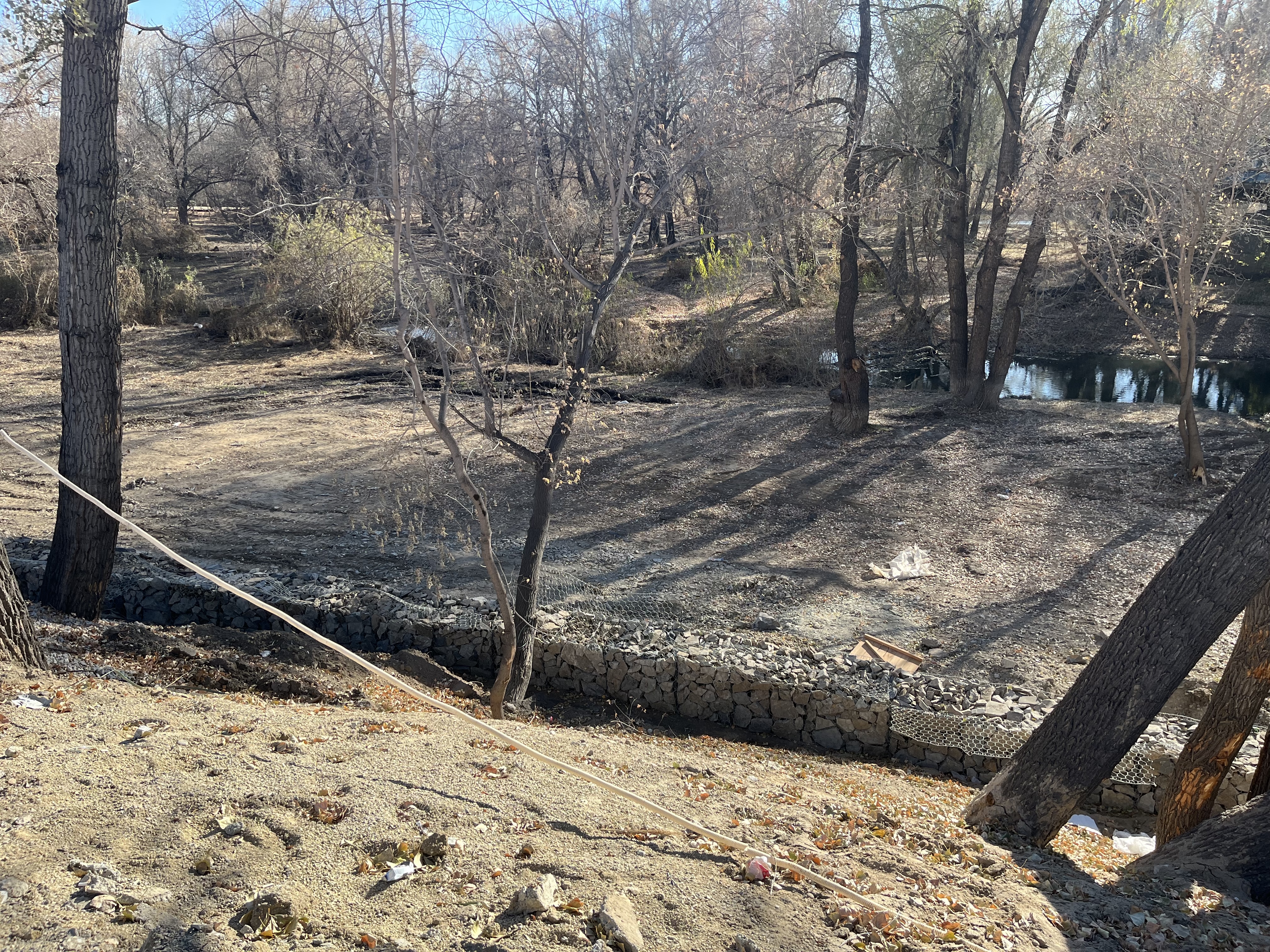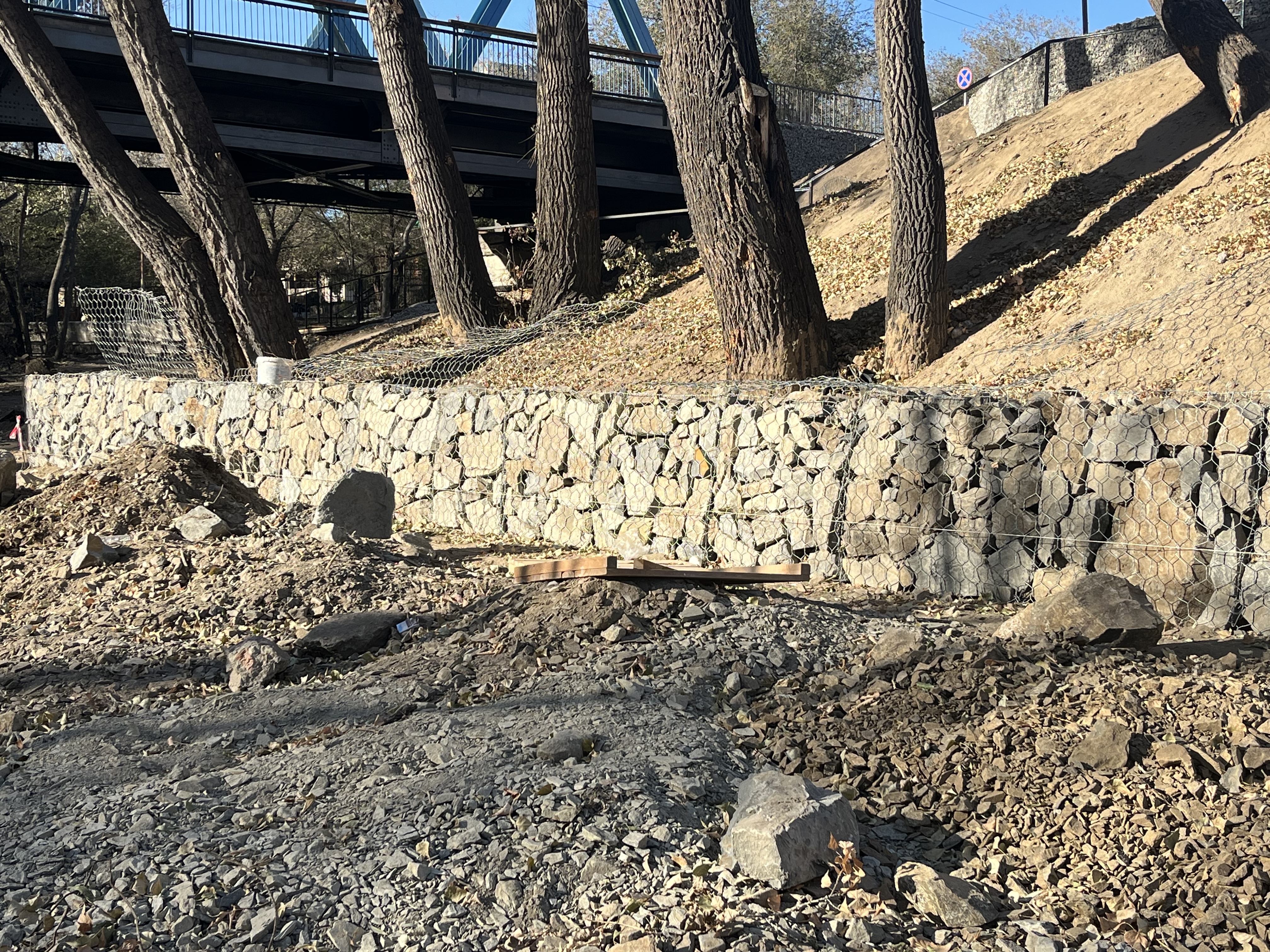 Если посмотреть в сторону реки, можно заметить, что на уровень ниже выровняли участок, очистили его от старых деревьев и укрепляют береговую линию.