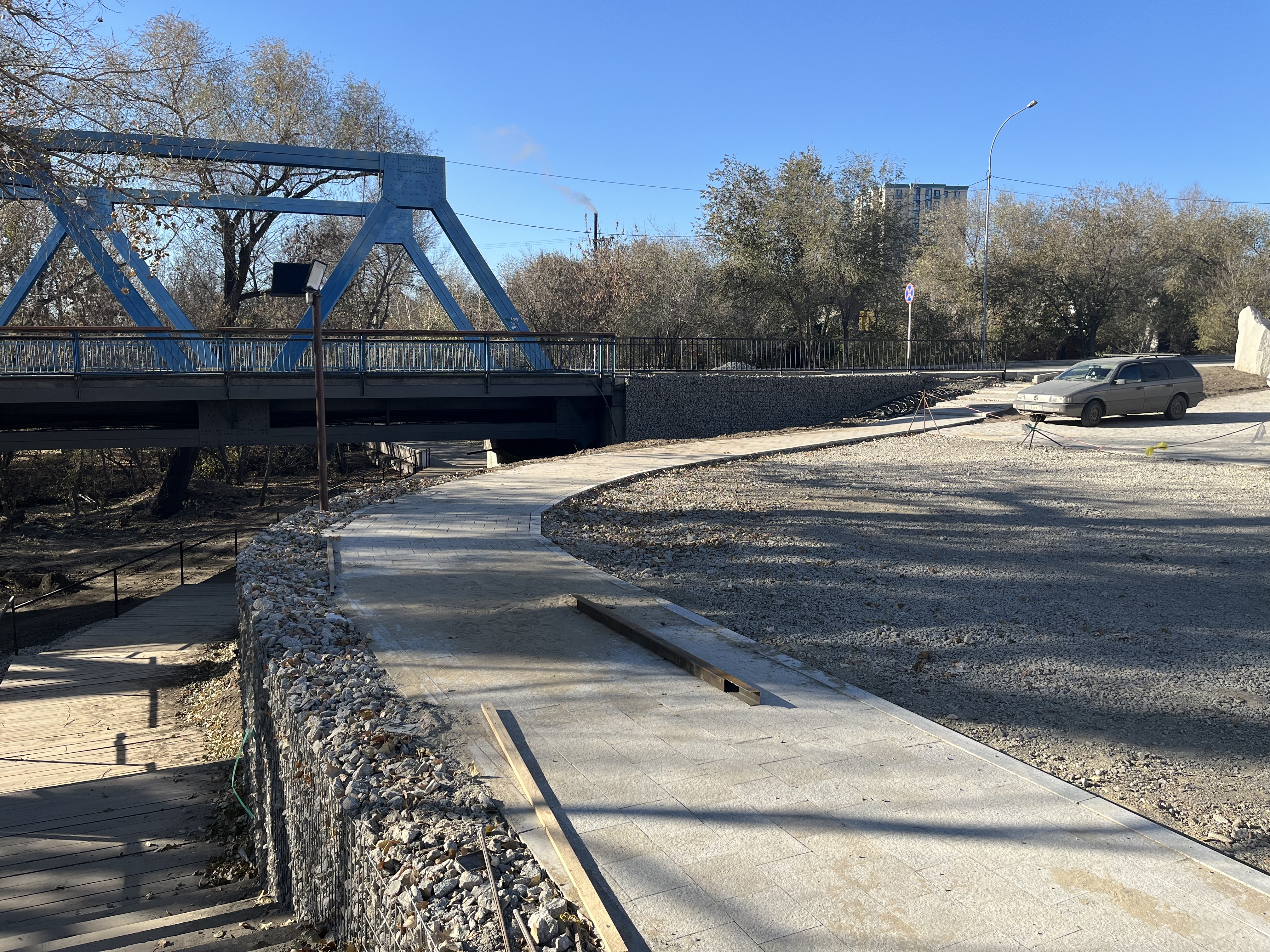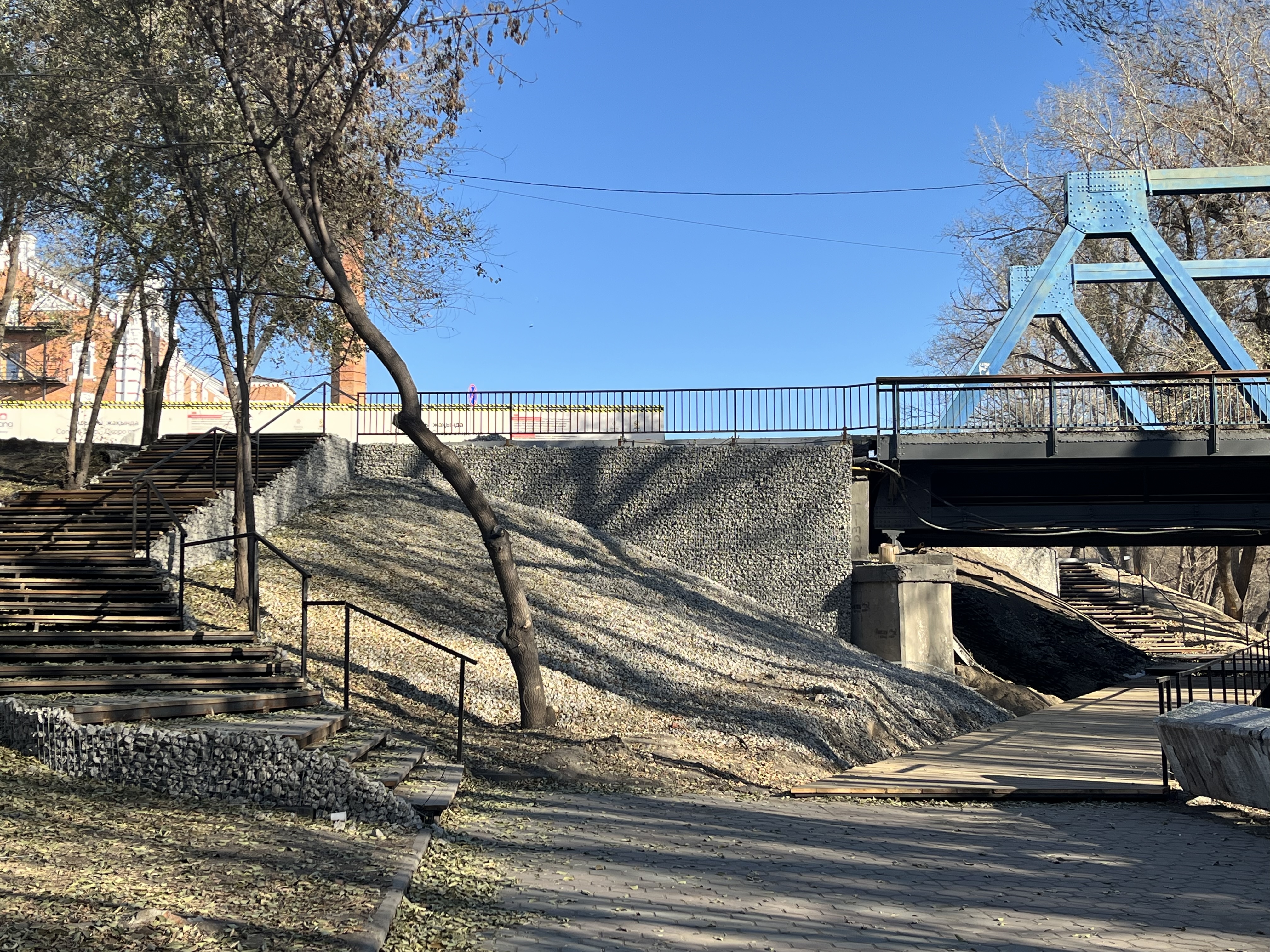 На подходе к мосту на остров Бейбітшілік с набережной сразу бросаются в глаза новые деревянные помосты с металлическими перилами. Один из них ведет вверх к мосту, другой проходит под ним и переходит в подъем уже с противоположной стороны. На самом мосту вдоль тротуара продлили металлические перила.