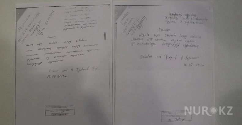 Слева - заявление, написанное лично Кулбековым. Справа - заявление на отпуск от имени Кулбекова, якобы написанное рукой акима. По словам юриста, разница в почерке на лицо. Фото: NUR.KZ