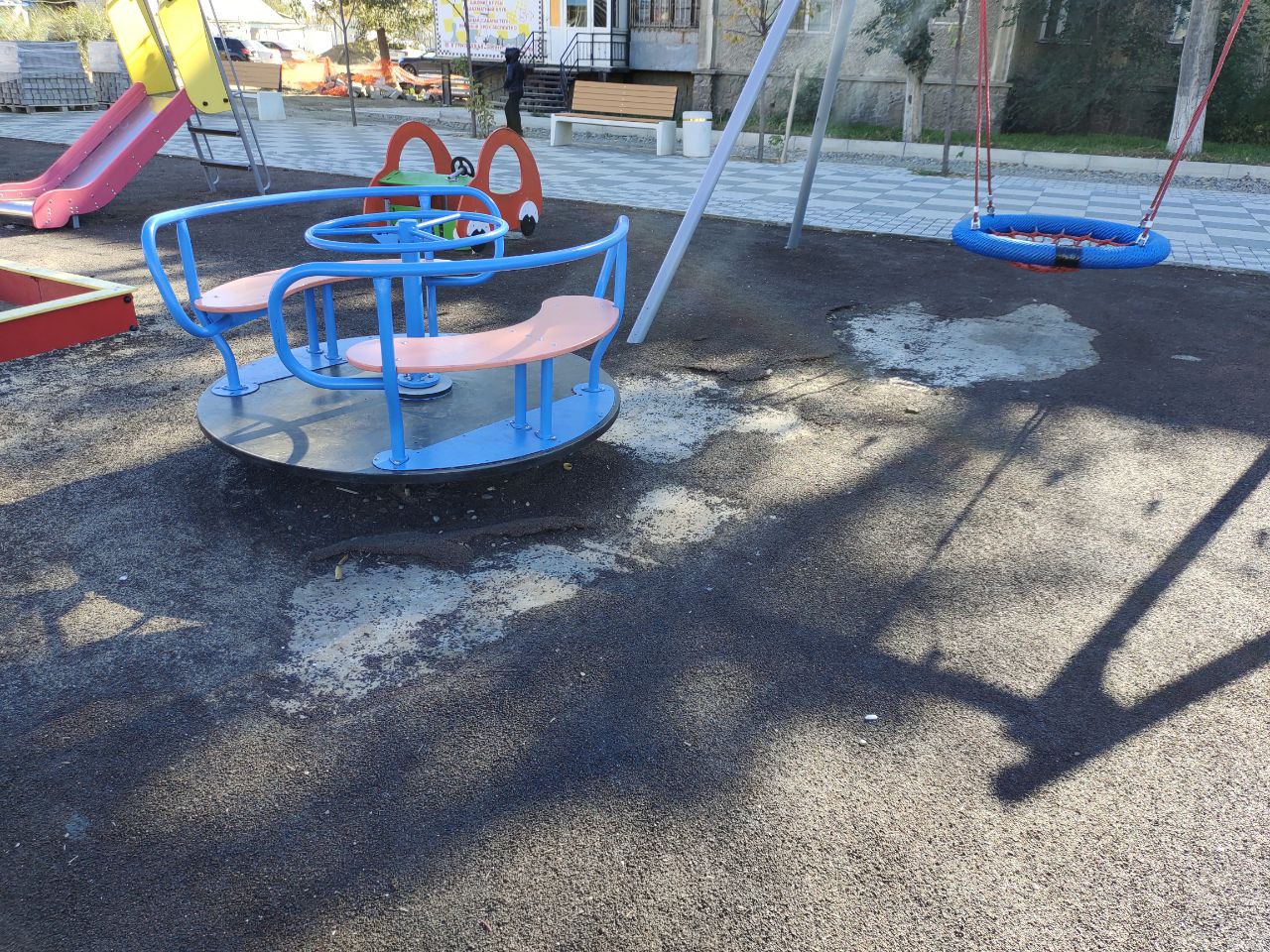 Детская площадка в целом сохранила первоначальный вид: аттракционы в хорошем состоянии, однако тартановое покрытие местами стерлось до основания.