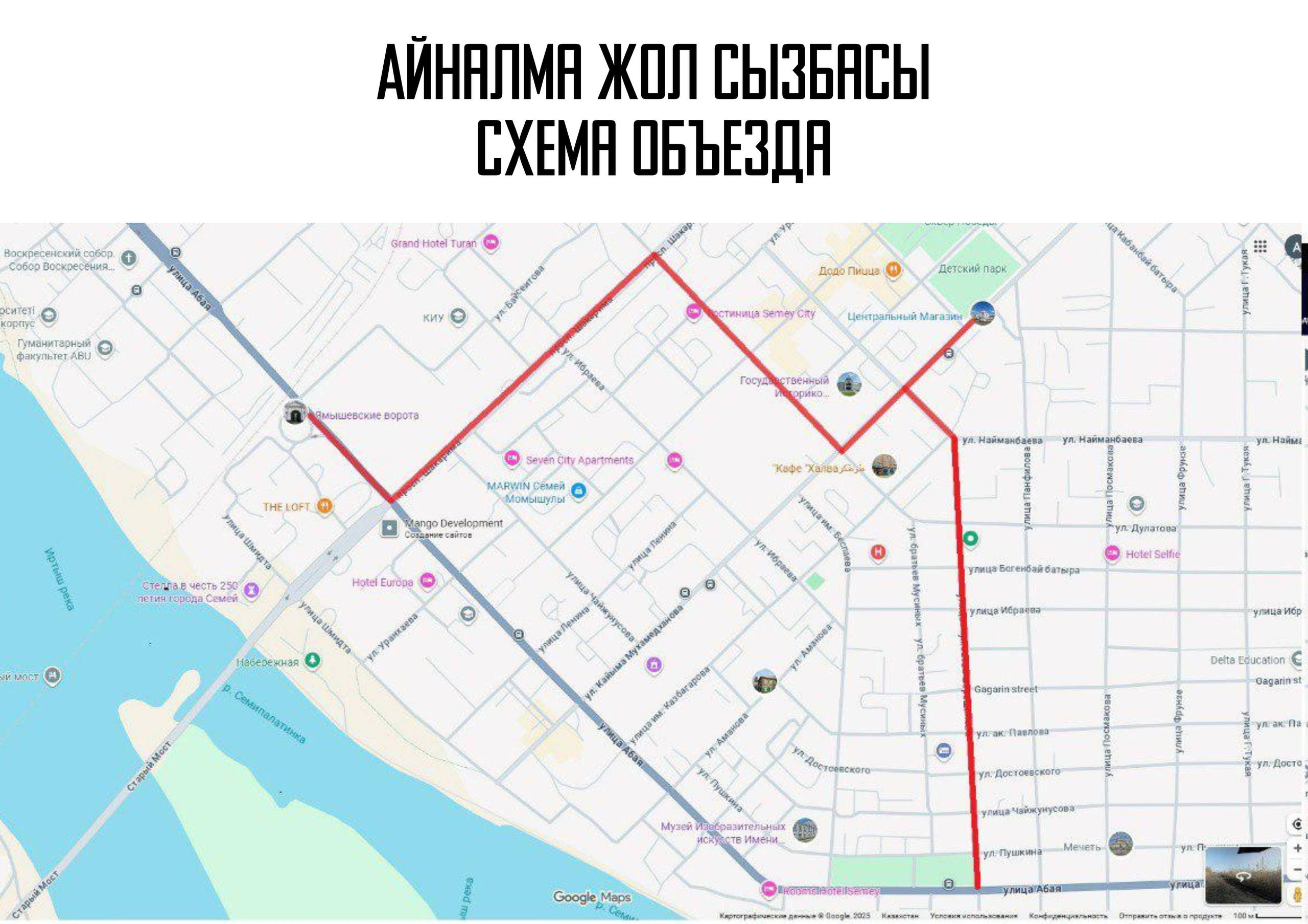 Схема объезда для маршрутов (направление от "Нового моста" в сторону улицы К.Мухамедханова) №№ 9, 28, 33, 36, 41, 56 с улицы Абая с левым поворотом на проспект Шакарима с правым поворотом на улицу Дулатова, далее с левым поворотом на улицу Мухамедханова, аналогично в обратном направлении.