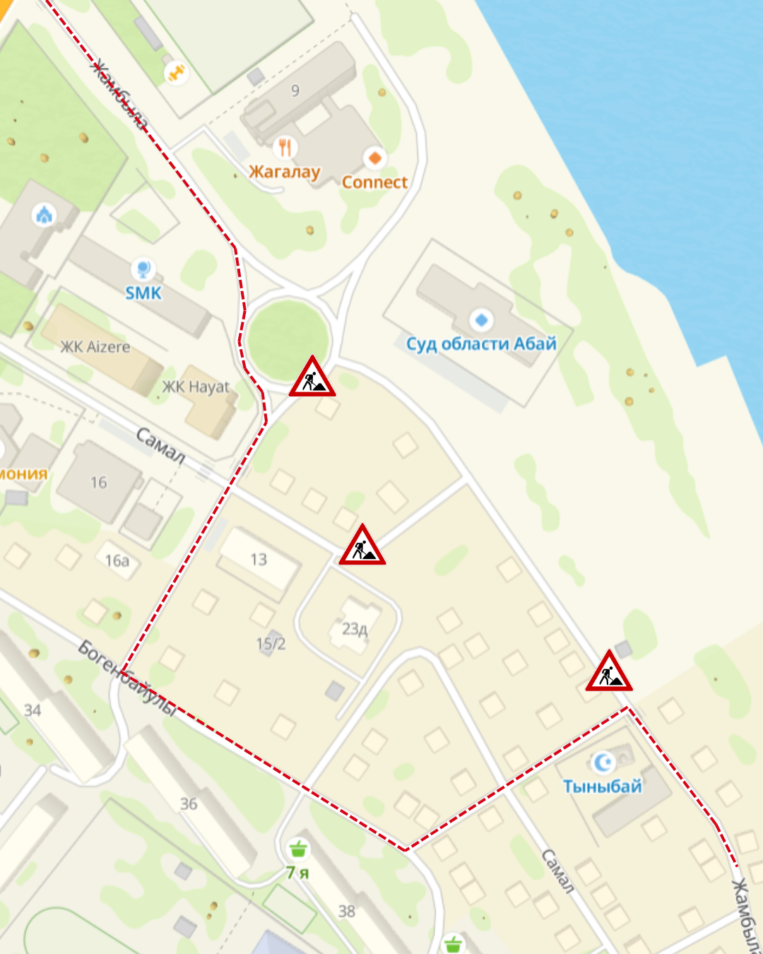 На участке работает техника, часть дороги по улице Жамбыла от кольца до пересечения с улицей Самал перекопана, движение здесь приостановлено. При этом само кольцо закрыто не полностью – выезд с улицы Бабатайулы на Жамбыла в сторону моста возможен при движении по кольцу по часовой стрелке.