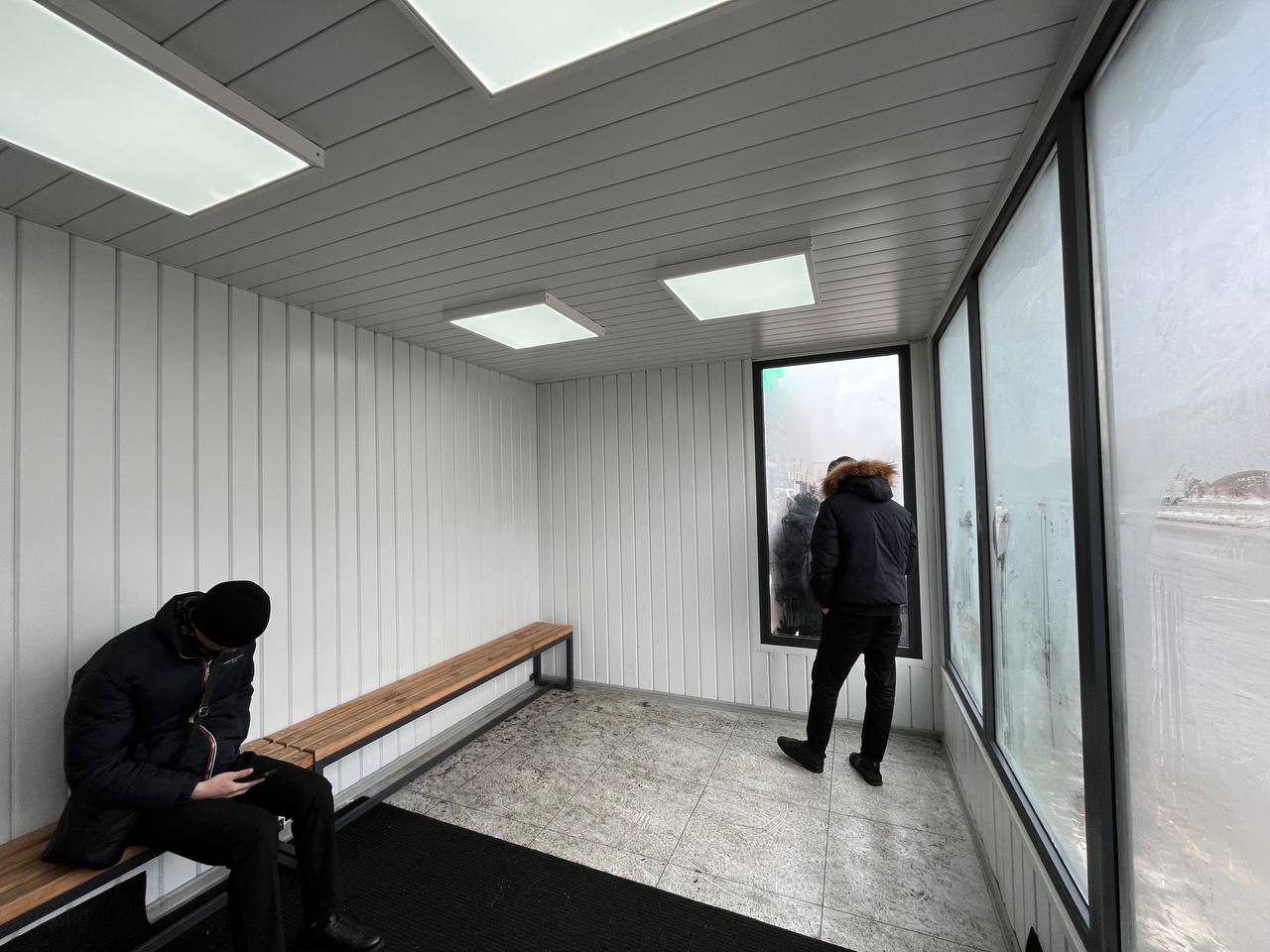 Здесь "теплая" остановка оправдывает свое название. Павильон, установленный этой осенью, выглядит аккуратно, на полу нескользящие коврики, освещение яркое, стены утеплены. Самое важное – возле двери работает тепловая завеса, создающая реальный поток теплого воздуха.