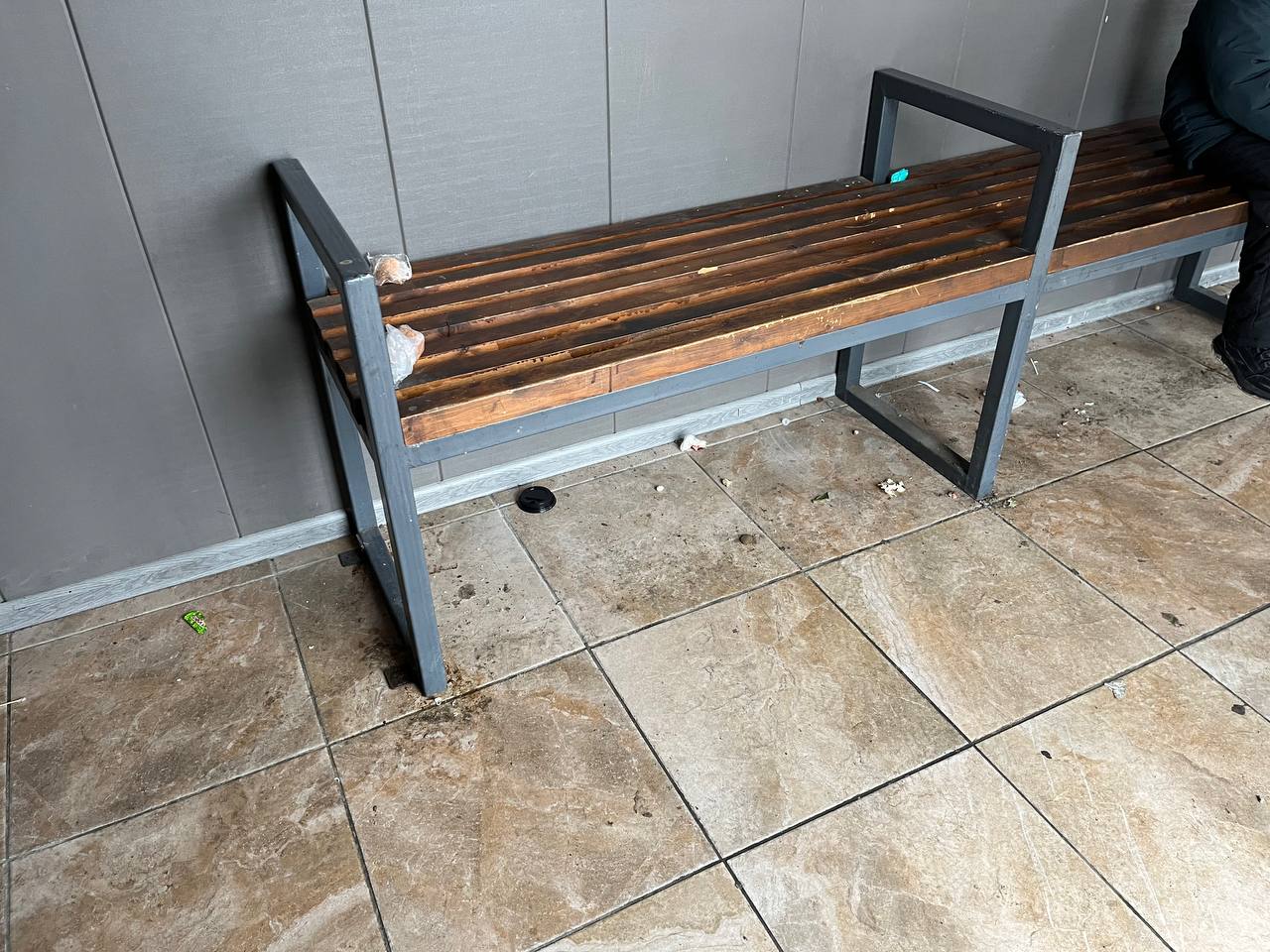 Здесь входная дверь не просто не закрывается, она нараспашку – сломанный доводчик не дает ей сдвинуться с места. Пол в павильоне покрыт резиновым нескользящим материалом, установлены скамейки, но обогревателя нет, хотя видны следы, что когда-то он был. Книжные полки, как и на предыдущей остановке, пустуют.