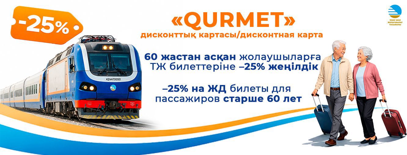 Теперь пассажиры старше 60 лет могут путешествовать по стране со скидкой 25% на железнодорожные билеты. Для этого достаточно оформить новую дисконтную карту QURMET, которая действует на все поезда Национального перевозчика и позволяет выбирать купе, плацкарт, сидячие вагоны без ограничений по месту. Карта стоит 3000 тенге и активна в течение года с момента приобретения.