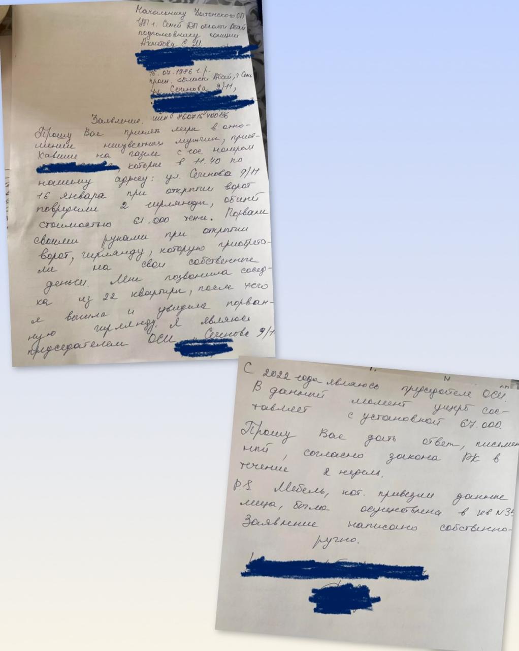 Жаңа жыл мерекесі қарсаңында тұрғындар пәтер маңын әсемдеп, жанып-өшетін гирляндылар іліп, аула мен көшеге мерекелік көрік берген әшекейді әлі күнге дейін әсемдікті бұзбай, гирляндыларды бүгінгі күнге дейін сақтап, айналаның көркем келбетін тамашалап келген. Бірақ, 16 қаңтар күні пәтер тұрғындарының біріне “Газельмен” жиһаз кіргізу кезінде жүк тасушы жігіттер гирляндыларды үзіп, бүлдіріп кетті дейді тұрғындардың айтуынша.