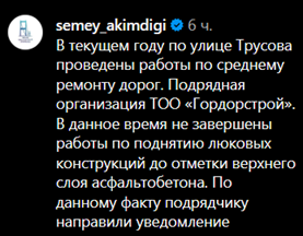 "В текущем году по улице Трусова проведены работы по среднему ремонту дорог. Подрядная организация ТОО "Гордорстрой". В данное время не завершены работы по поднятию люковых конструкций до отметки верхнего слоя асфальтобетона. По данному факту подрядчику направили уведомление", – говорится в комментарии.